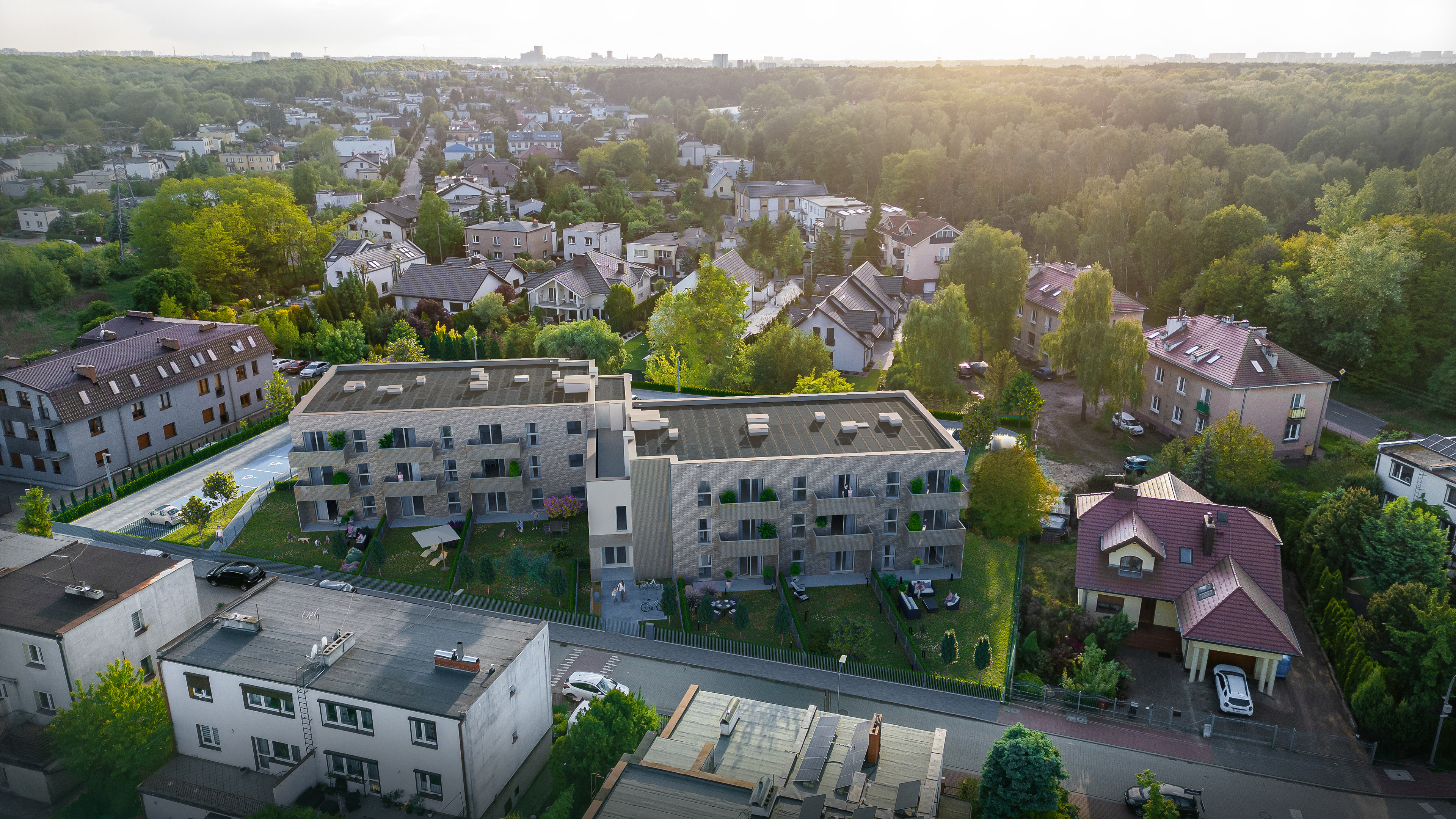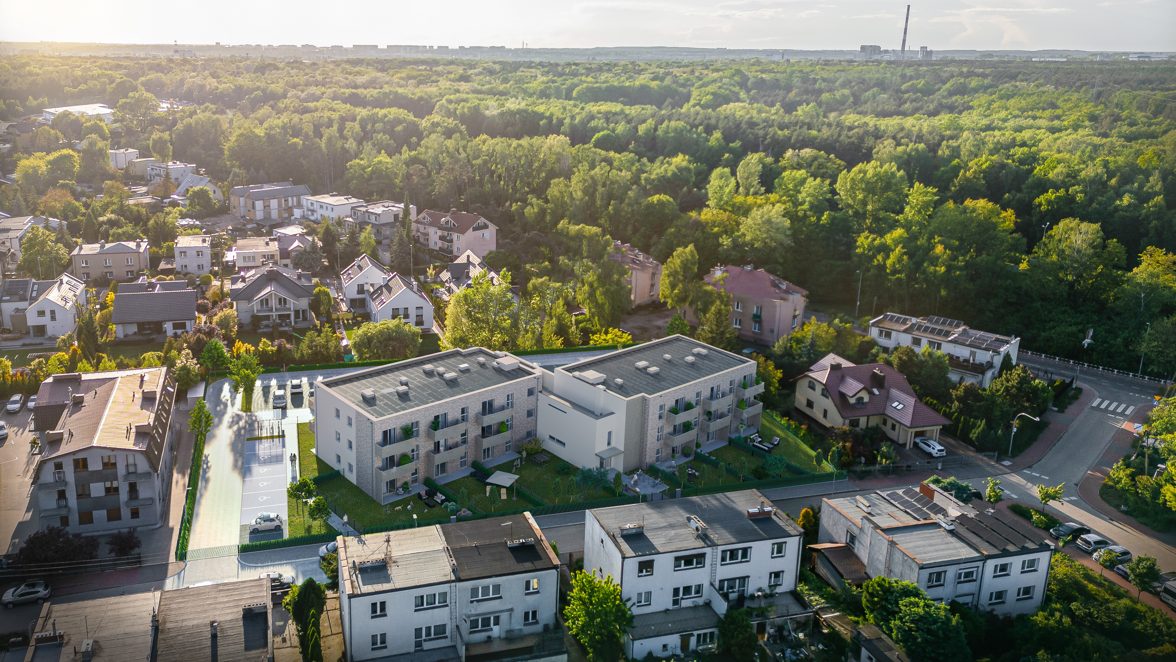 Inwestycja składa się z dwóch budynków dwupiętrowych posiadających ogródki na parterze wraz z osiedlowym wewnętrznym parkingiem.