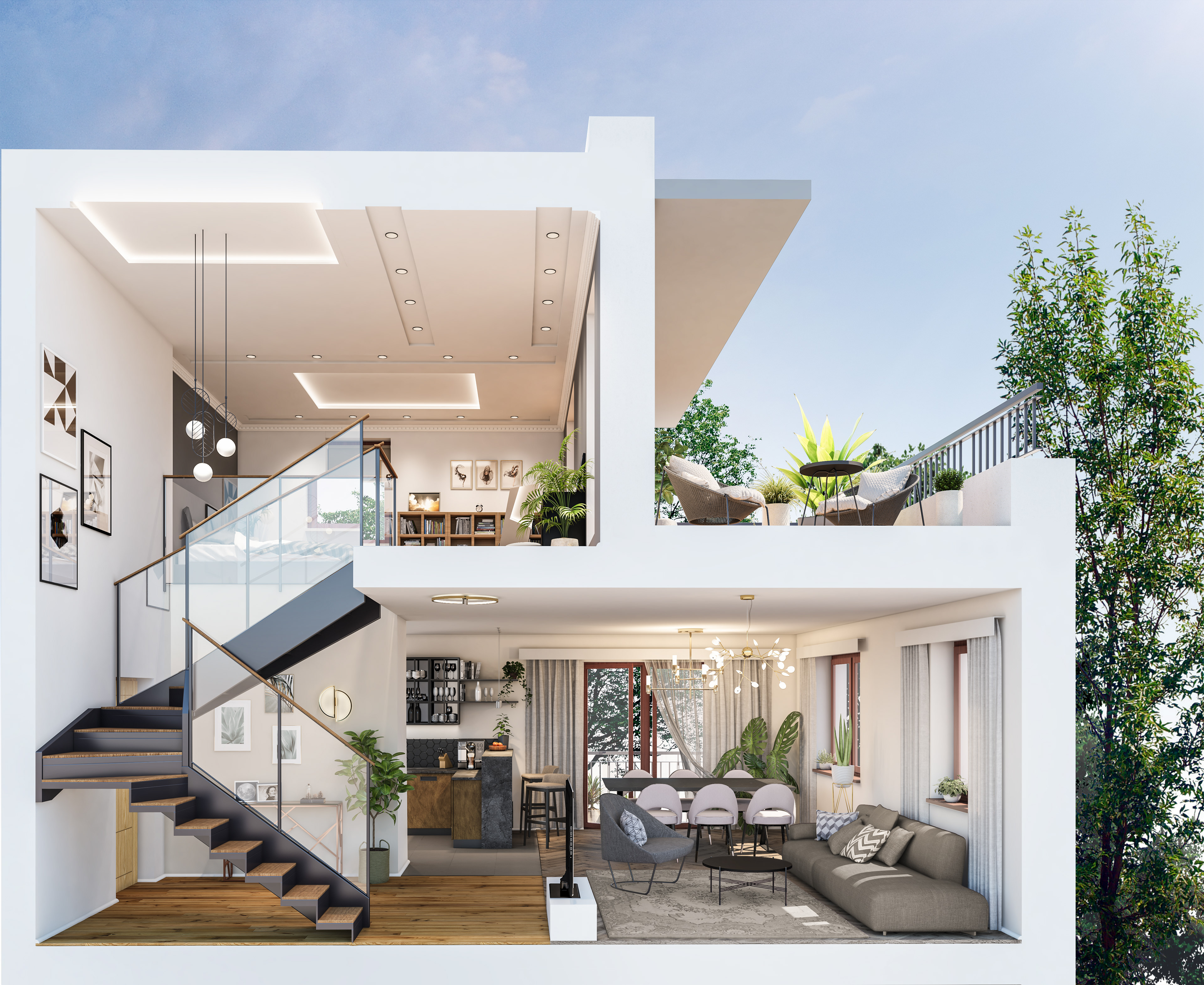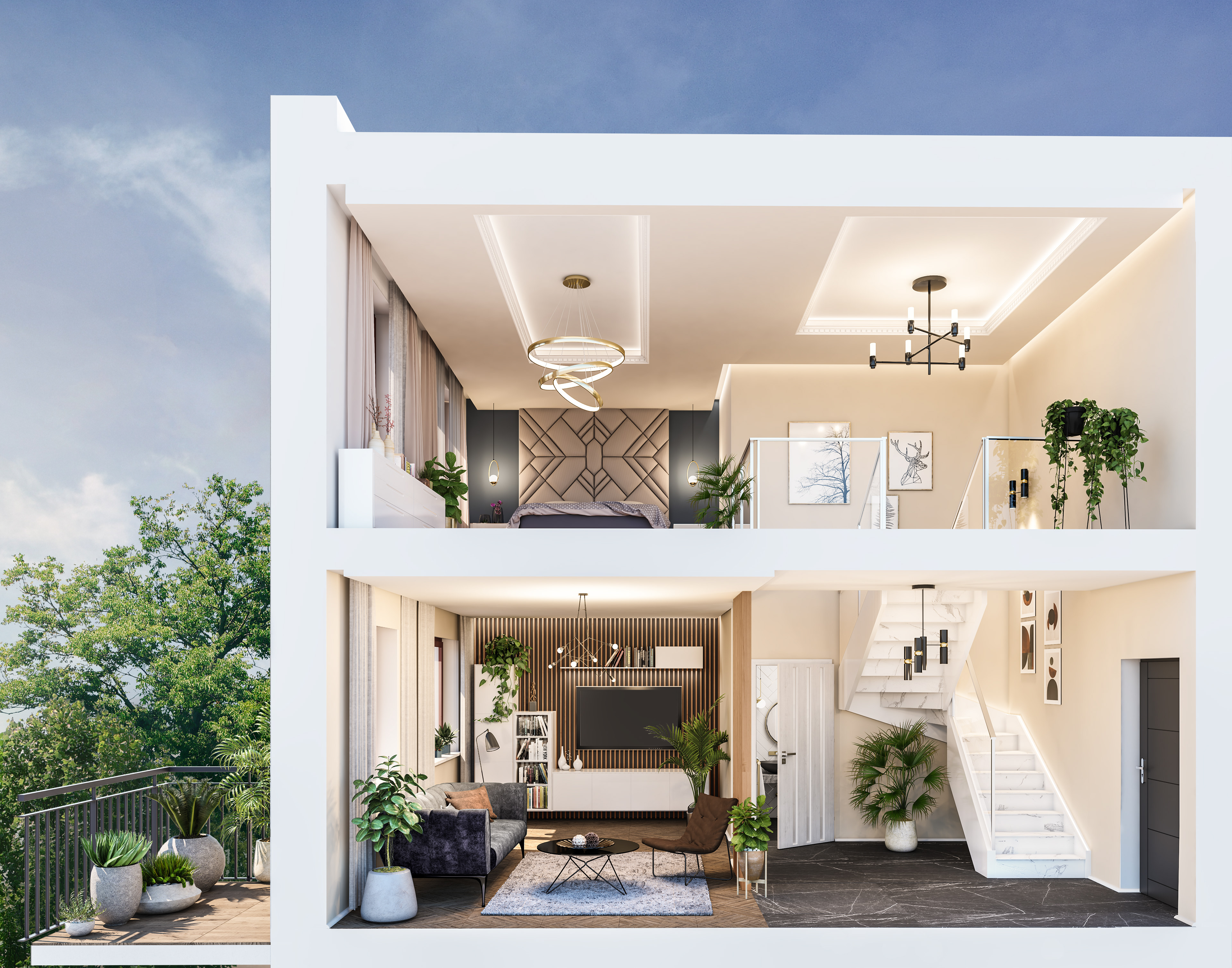 Wizualizacje przekrojowe apartamentów z antresolami - inwestycja Vitalia Residence przy ulicy Fabrycznej w Oporowie (obrzeża Wrocławia).
